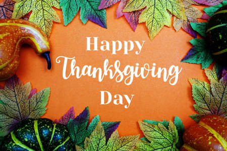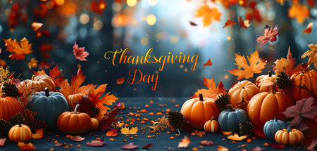 A festive image of pumpkins and autumn leaves on a table, with the words Thanksgiving Day written in the background.