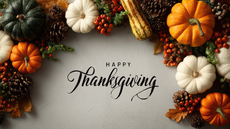 Celebrate Thanksgiving with this warm and inviting autumn scene featuring colorful pumpkins, gourds, and pine cones, perfect for festive decor.