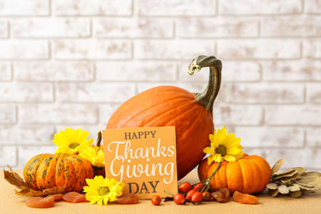 Tasty pumpkins, flowers and text HAPPY THANKSGIVING DAY on table against brick wall