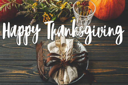 Happy Thanksgiving text sign on cutlery, linen, anise star, plate, autumnal floral arrangement and pumpkin on rustic wood. Seasons greetings. Happy Thanksgiving greeting card. Holiday dinner