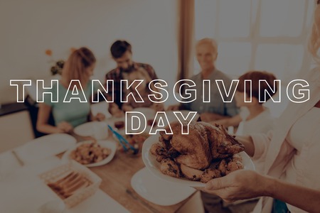 Happy Thanksgiving lettering on a festive dinner background. Food table background with autumn seasonal specialties for Thanksgiving Day. Fried chicken with pumpkin, vegetables and autumn decor. high quality photo