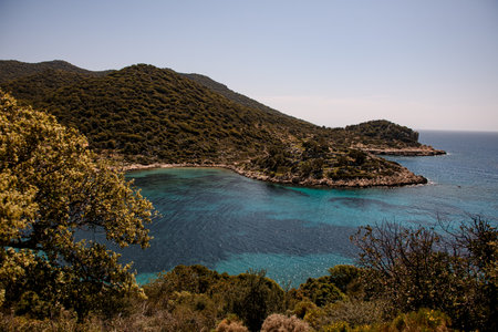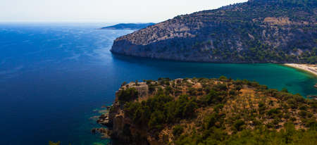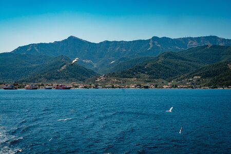 Mountains and azure Aegean sea on a bright sunny day. Travel to Turkey. Beautiful seascape. Panorama.