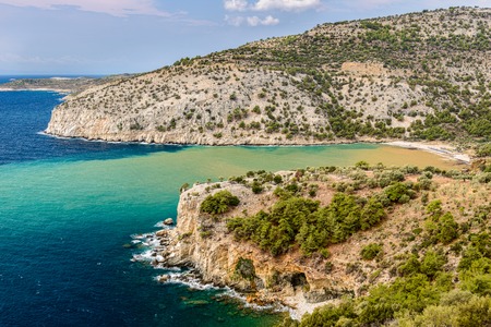 Seascape and sandy beach with turquoise clear waters and trees in Greece