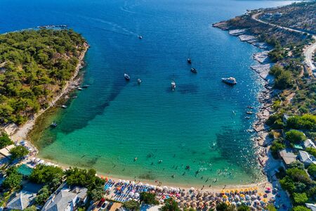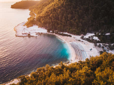 View from above, aerial view of an emerald and transparent Mediterranean sea with a white beach full of beach umbrellas and tourists who relax and swim. Porto Vathy, Marble Beach, Thassos island, Greece