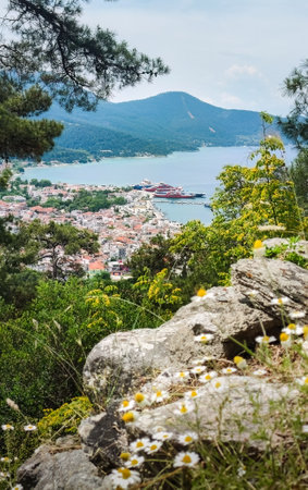 Top panoramic view of Limenas capital city and port of Thasos or Thassos Greek island in the North Aegean Sea.