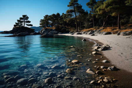 AI Generated. Beautiful coastal landscape with clear turquoise water and rocky shoreline under a bright blue sky