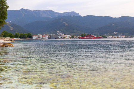 Greece summer vacation background with sea water bay and pine trees, Thassos port and town view with ferryboat
