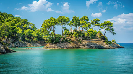 a small Greek island adorned with a white church, surrounded by crystal-clear turquoise waters, and lush pine trees in the village.