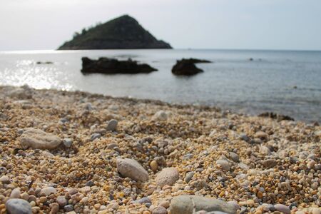 View of Tirrenic sea and little island called Isolotto with stony beach on the foreground. Copy Space. Porto Ercole, Tuscany, Italy
