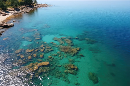 Clear water along rocky shore, top-down view