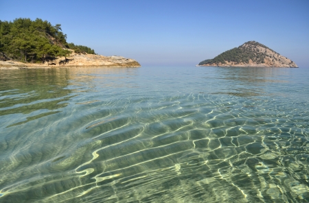 The pure waters of the Mediterranean sea at the Paradise beach on the island of Thassos, Greece