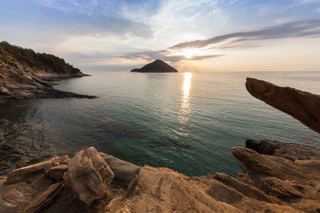 Sunset Bottle Beach on Phangan Island Thailand Nature Landscape. Asian Tropical Tourist Coastline, Tropical Wood and Mountains. Amazing View from Rock on Sea. Panoramic Photo on Ocean and Cloudy Sky