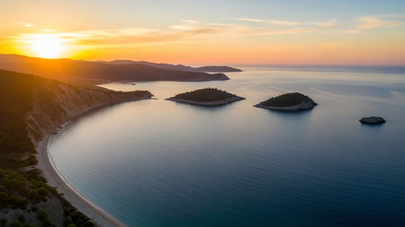 Serene showing serene sunset over a calm blue ocean with a curved sandy beach and small islands offshore keywords: sunset, sunrise, ocean, sea, water, coast, beach,...