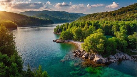 Aerial view of beautiful mountain lake in summer. Nature composition.