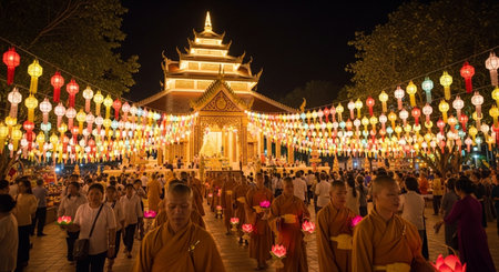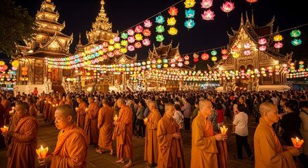 Ang Thong, Thailand-July 11,2014: Buddhists and monks walk with lighted candles clockwise round the temple, Asaha Puja Day and the beginning of Buddhist Lent, at Wat Muang- Ang Thong, Thailand.