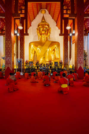 Bangkok, Thailand - 18 Aug 2019 : Chinese Thai monks praying for buddhism worship inside Wat Bhoman Khunaram (Bhoman Khunaram Temple).