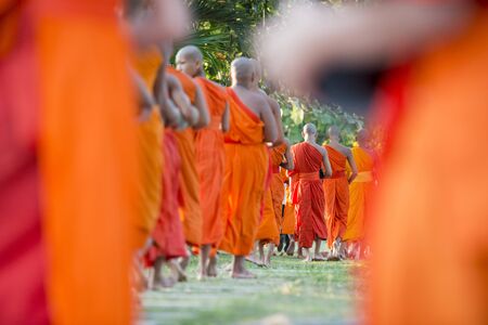 Chiang Rai, Thailand - February 9, 2018: Monks walk on the road in Wat Phra Kaew, Chiang Rai, northern Thailand.