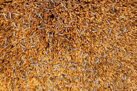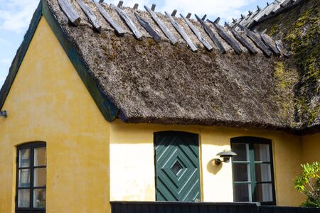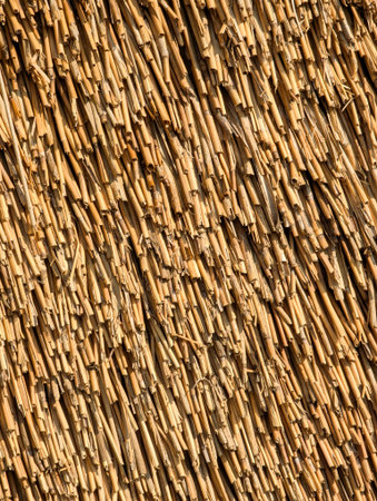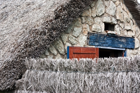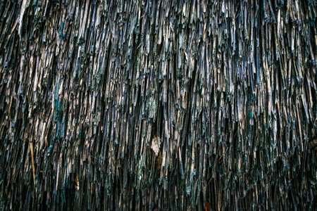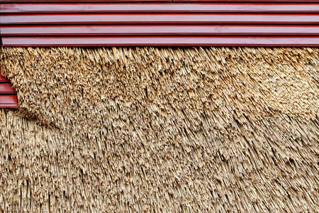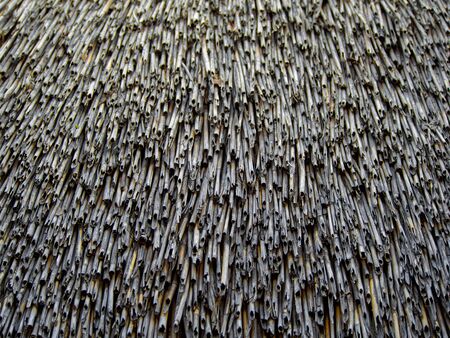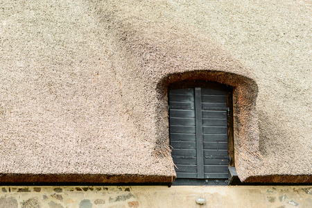 Tightly packed reed roof with black wooden hatch. Detail of traditional barn.
