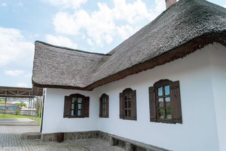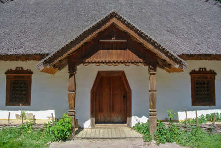 Ukrainian authentic house. Old authentic wooden typical house. The architecture of traditional Ukrainian village