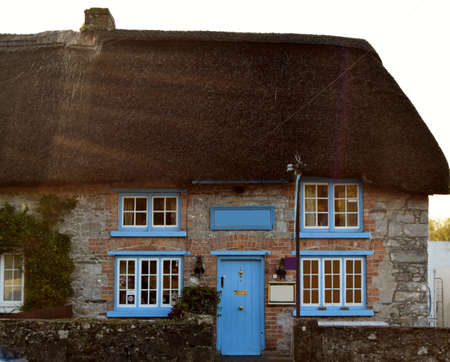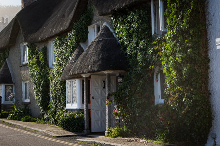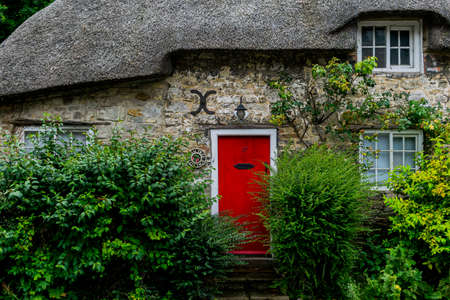 West Lulworth, United Kingdom - 19 July 2020: Beautiful thatched cottage house with red coloured door and shutters, unique Dorset colorfull house decorations at 17 Main Road