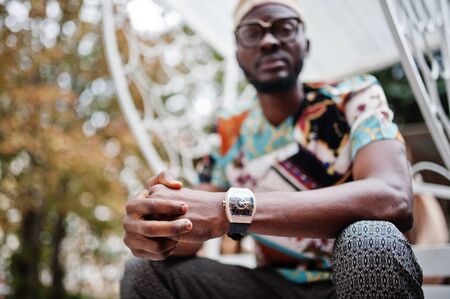Mega stylish african man in traditional jacket pose. Fashionable black guy in hat and sunglasses.