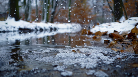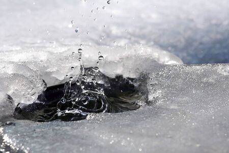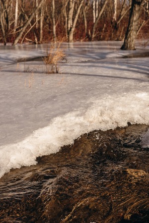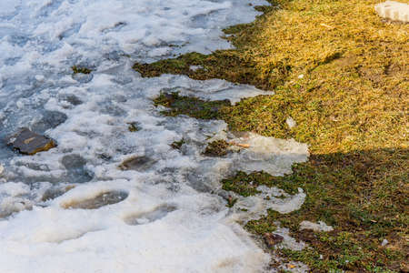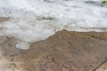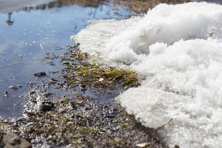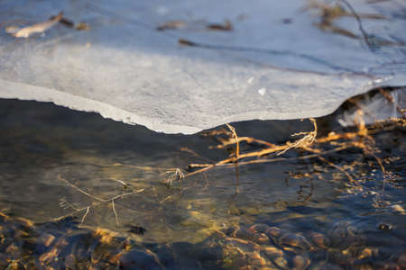 Ice and snow in puddles in spring or autumn time. Thaw after winter in nature