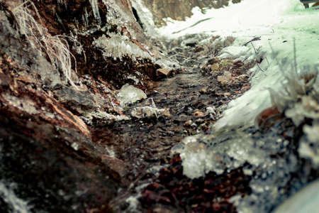 mountain stream flows trought stones, snow and icicles