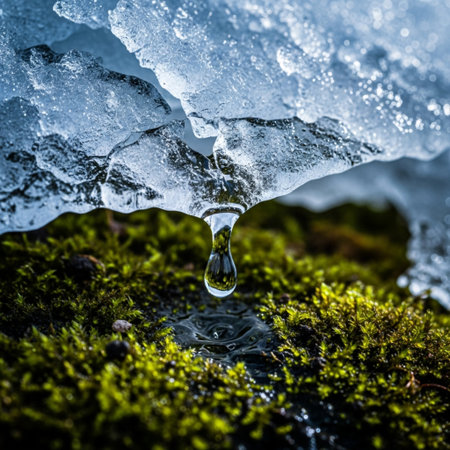 Macro view of water dripping from a fractured icicle onto vibrant emerald moss under harsh, dramatic