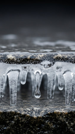 A close-up of a frozen faucet with icicles hanging, winter scene.