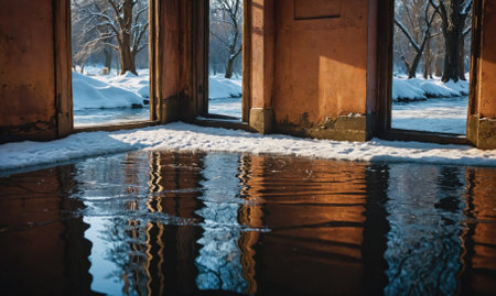 A flooded room in an abandoned building with snow outside and reflections in the water