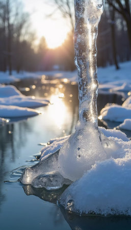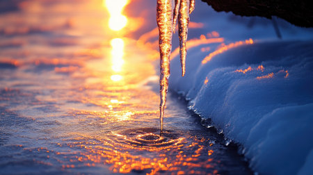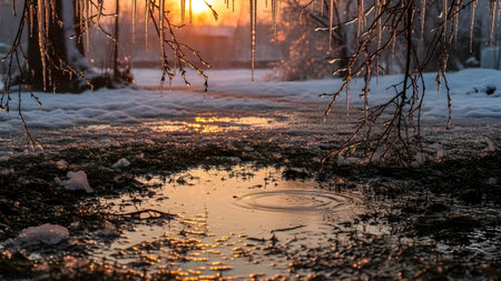 The warm light of a winter sunrise or sunset reflects beautifully in a melting puddle, adorned with delicate icicles hanging from bare tree branches. This serene scene captures the peaceful transition from deep winter as ice slowly melts, revealing the ground beneath.