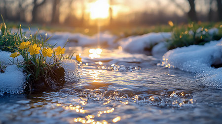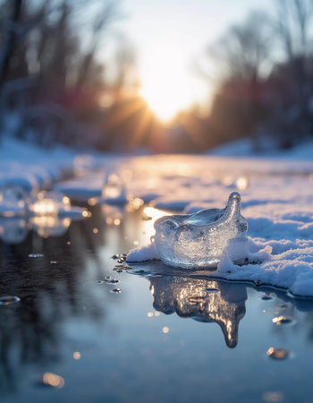 Glistening ice fragments line the tranquil river as the sun sets, casting warm hues across the water. Spring awakens nature, creating a serene atmosphere filled with hope and renewal.