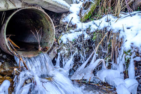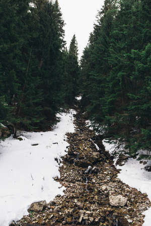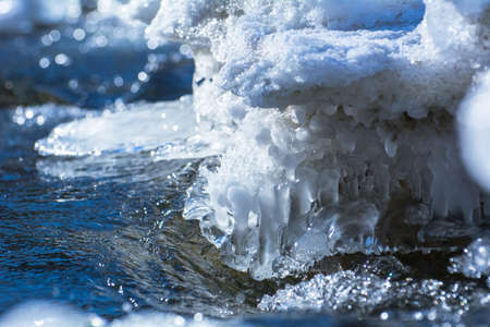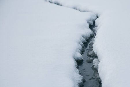 Cold mountain stream, snow landscape in winter scenery.