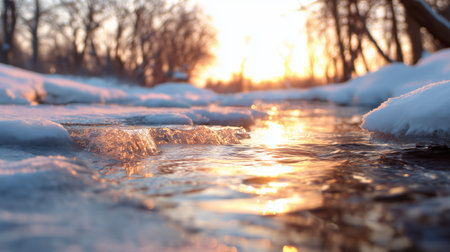 Winter stream flows under sunset near trees with snow on the ground in a quiet area