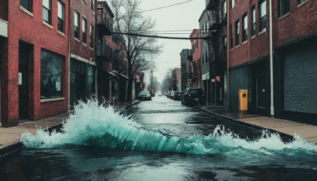 Dramatic urban wave flooding desolate city street with intense energy.