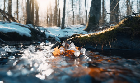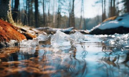 Sunlight breaks through the trees at dawn, reflecting off a tranquil river dotted with melting ice. Icicles hang nearby, creating a peaceful and warm spring atmosphere. Generative AI.