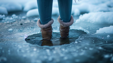 A woman dips her toes into a small hole into the icedover surface of a lake her expression a mix of trepidation and excitement