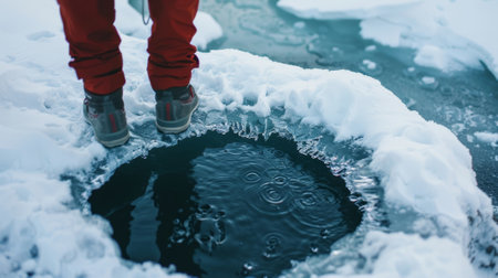A person standing on the edge of the ice hole preparing to jump into the unknown