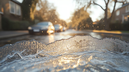 Water from melting ice creates a reflection of a car, showing the seasonal change from winter to spring in a city environment.