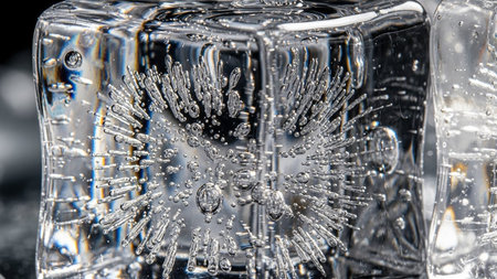 Detailed macro view of a transparent ice cube with numerous air bubbles creating a unique starburst pattern.