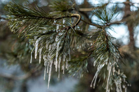 Ice icicles on a branch of a blue Christmas tree, close-up. The concept from now on, change of weather, rain and frost.