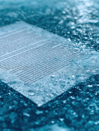 A paper document partially submerged in water, surrounded by droplets, showing the interplay between the text and liquid.