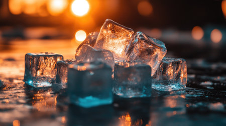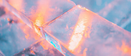 Pile of ice cubes with light shining through, showing clean, transparent edges that emphasize their refreshing coldness.