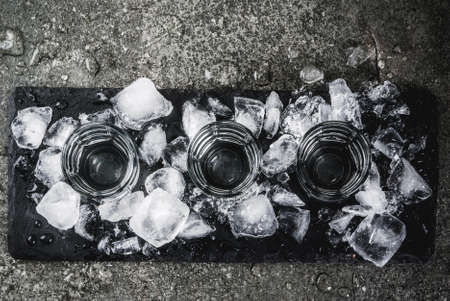 Alcohol and cocktails. Three glasses of vodka on a slate tray, with ice. On a black stone table, Copy space top view