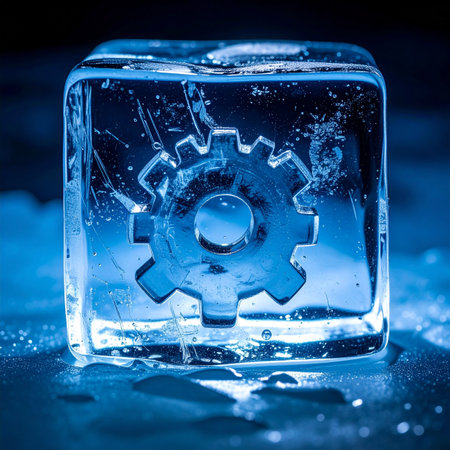 A metal gear, a symbol of industry and progress, is perfectly preserved within a block of crystal-clear ice.