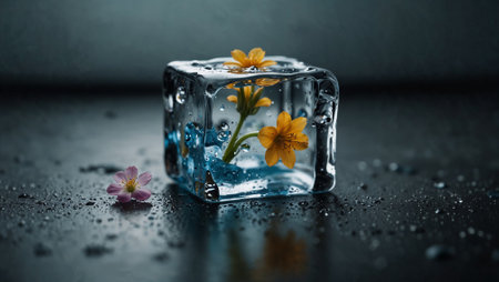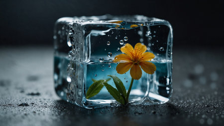 Flower inside a melting ice cube. Nature concept. Environmental protection and global warming idea. Copy space.
