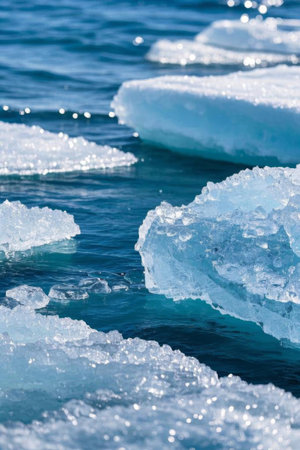Amazing view of a frozen lake with partially thawed ice, showcasing intricate textures and captivating contrasts in shades of blue and white.