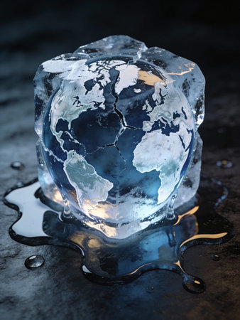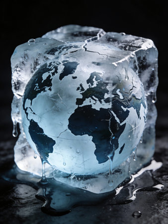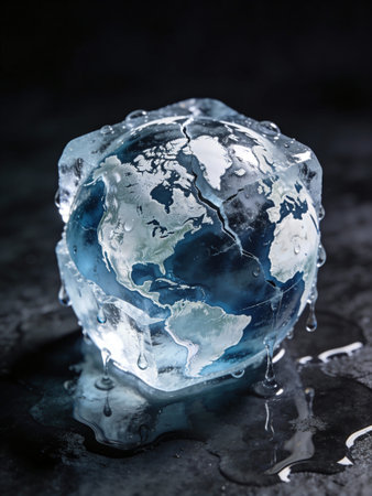 Earth as a melting ice sculpture on a blue background, environmental concept
