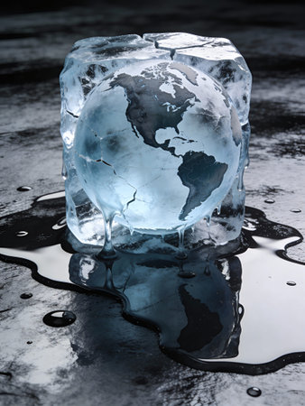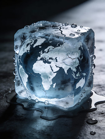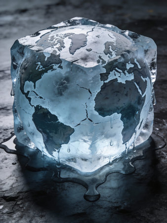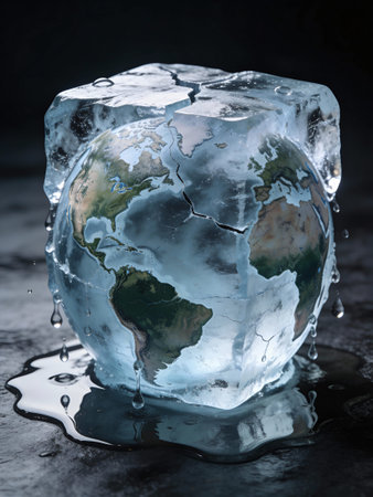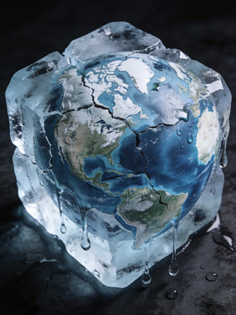 Earth frozen in ice cube. Global warming and climate change concept.
