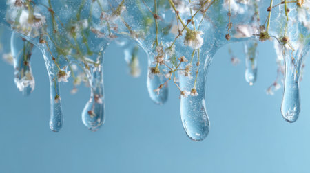 Delicate flowers are encased in melting ice, dripping slowly against a soft blue background. This captivating scene evokes a feeling of tranquility and beauty in nature during winter.